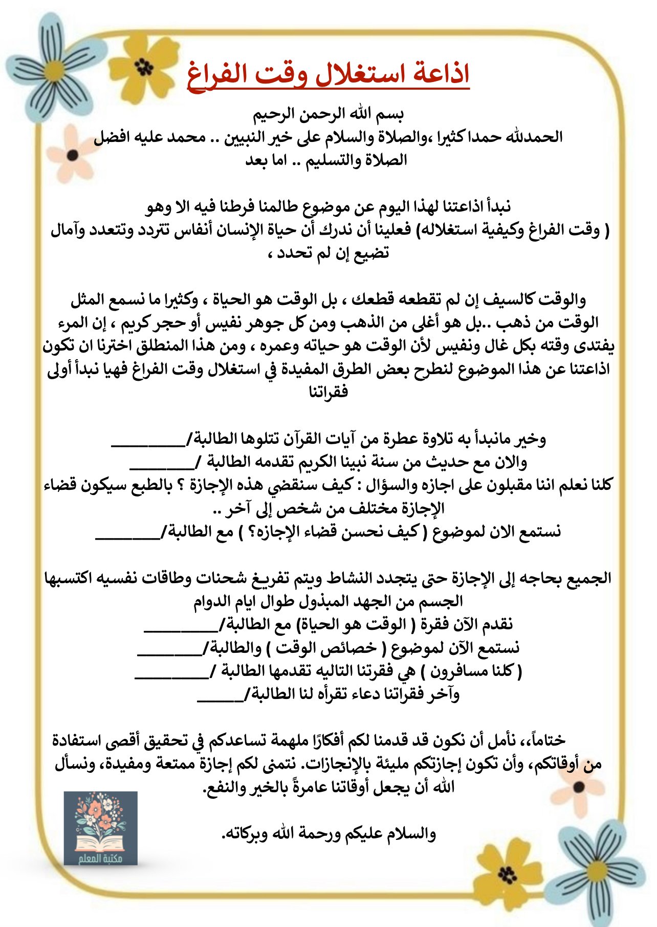 - اذاعة متكاملة عن ( إستغلال وقت الإجازة ) بصيغة pdf جاهزة للطباعة