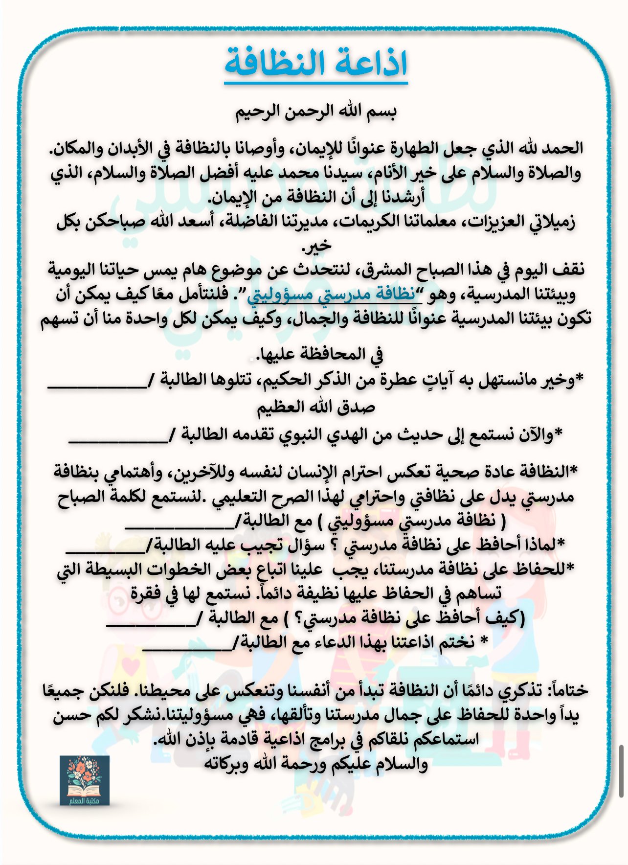 اذاعة مدرسية بعنوان (نظافة مدرستي مسؤوليتي ) بصيغة pdf جاهزة للطباعة