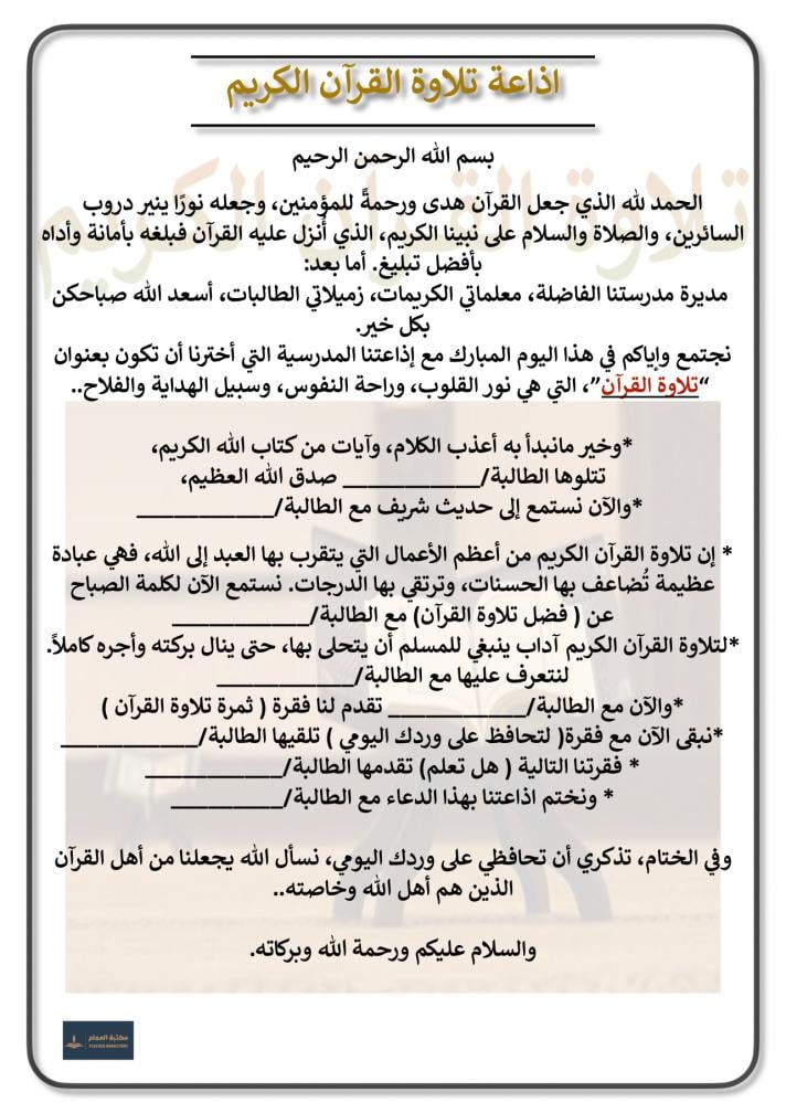 اذاعة مدرسية متكاملة بعنوان ( تلاوة القرآن الكريم )